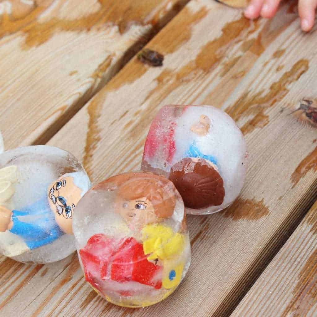 Eine Super Abkühlung; die alle Sinne anspricht. In großen Formen wie zum Beispiel Muffinförmchen oder Förmchen aus Silikon können je nach Interesse des Kindes verschiedene Dinge in Wasser eingefroren werden. Das können Sachen aus der Natur wie Kräuter sein, aber auch Spielsachen wie Duplo-Figuren kommen gut an.