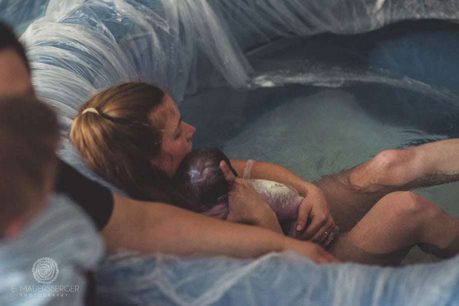 Ich hebe unser Kind schließlich aus dem Wasser und lasse mich nach hinten auf den Po fallen. So kann ich mich an der Wand des Pools anlehnen. Ich betrachte dieses kleine lila Bündel in meinen Armen und atme durch. Noch regt sich nichts. Ich flüstere „Atme! Du musst atmen.“ Und dann ertönt eine kleine zarte Stimme. Der erste Schrei.